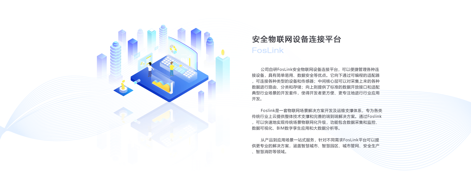 公司自研FosLink安全物聯網設備連接平臺,可以便捷管理各種連接設備,具有簡單易用、數據安全等優點。它向下通過可編程的適配器,可連接各種類型的設備和傳感器;中間核心層可以對采集上來的各種數據進行路由、分類和存儲;向上則提供了標準的數據開放接口和適配典型行業場景的開發套件,使得開發者更方便、更專注地進行行業應用開發。